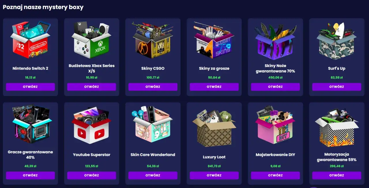 Sklep ten skupia się przede wszystkim na lootboxach ze skinami do CS2, ale tym razem to zaledwie wierzchołek góry lodowej. Niestety na próżno na nim szukać pudełek, które skupiają się na innych grach online. Ale posiada on także bogatą ofertę innych mystery boxów. Te posiadają w sobie produkty wysokiej jakości, które byłyby idealnym prezentem dla każdego. Mowa tutaj o zegarkach, perfumach, akcesoriach do konsol i komputerów, czy innych elektronicznych gadżetach.